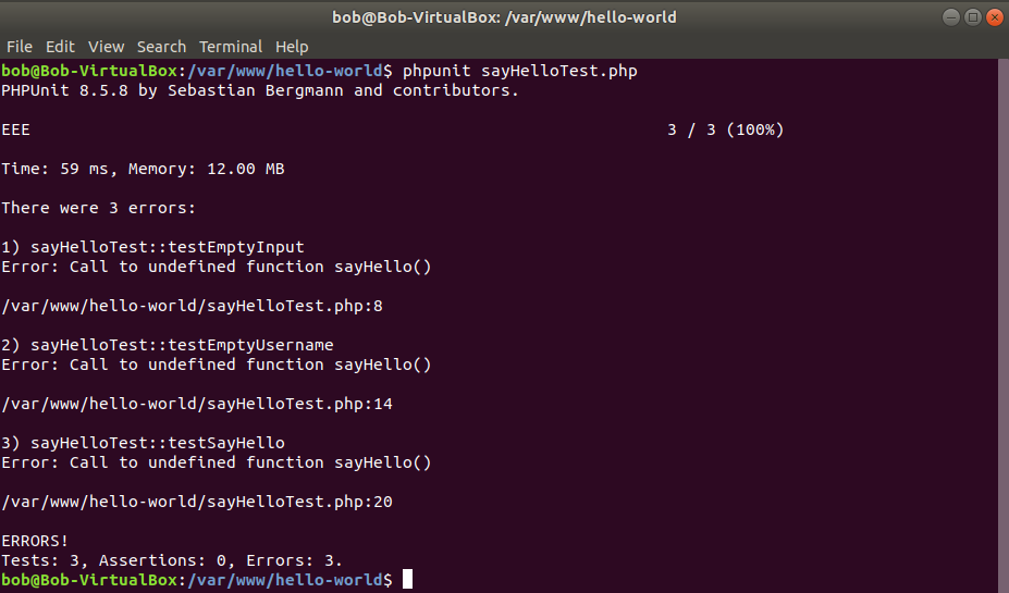 2 bob@Bob-VirtualBox:/var/www/hello-world$ phpunit sayHelloTest.php