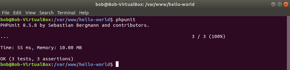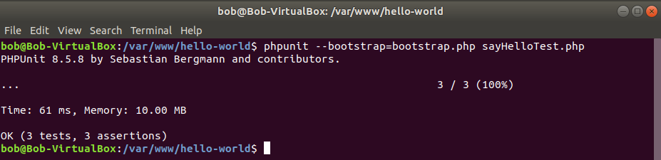 1 bob@Bob-VirtualBox:/var/www/hello-world$ phpunit --bootstrap=bootstrap.php sayHelloT\