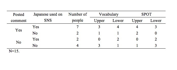 Seven participants usually used Japanese on SNS, and two of the participants who had not used Japanese on SNS before, wrote their comments on Facebook. The rate of participants who usually used Japanese on SNS was higher than that of participants who had not used Japanese on SNS. There was no significant difference between the upper and lower groups in their vocabulary pretest scores. However, the rate of participants who wrote their comments on Facebook was slightly higher in the upper SPOT group. Six participants in the upper group wrote their comments on Facebook compared with three from the lower group.