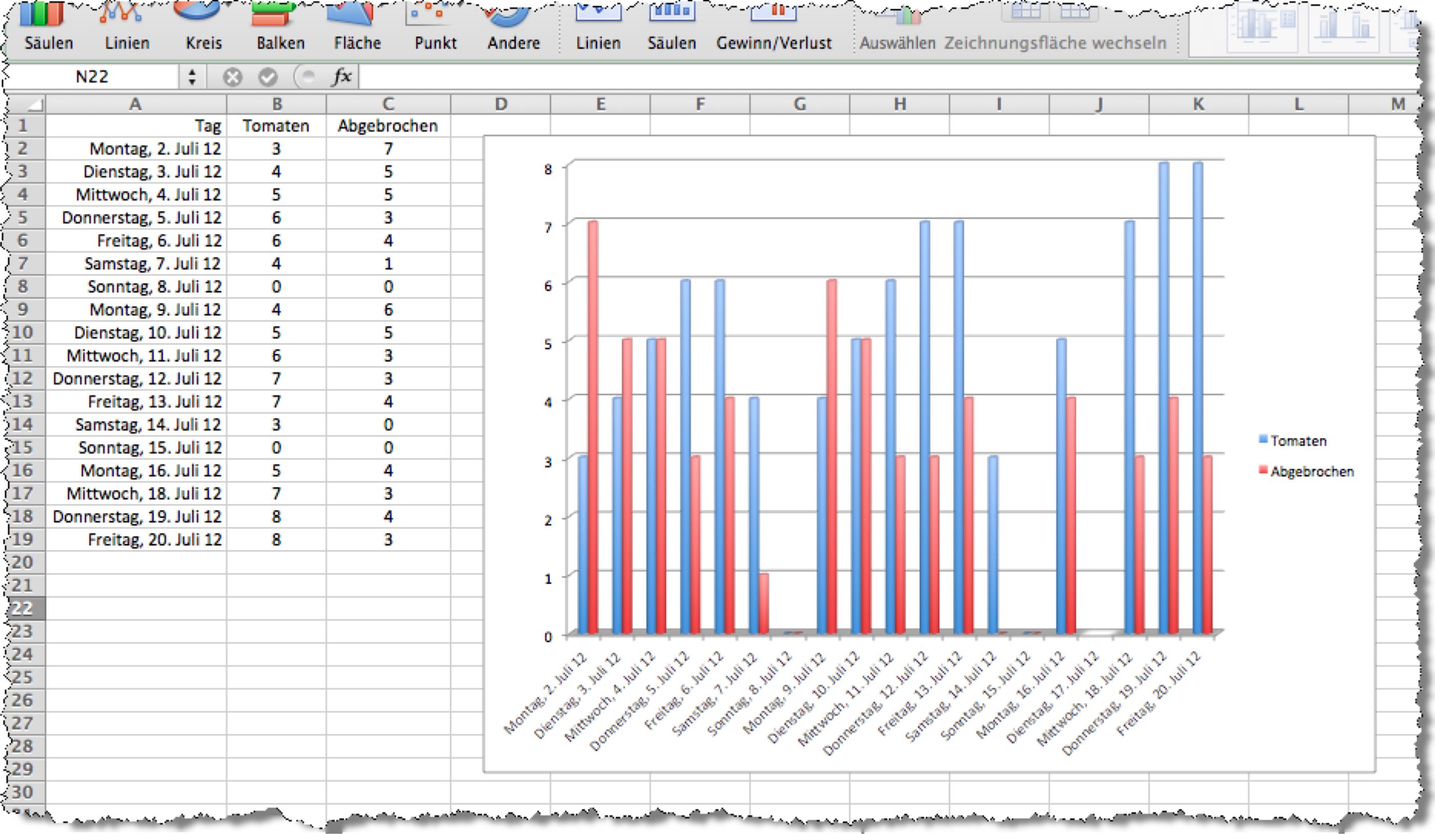 Führen Sie also ein „Tomatentagebuch". Tragen Sie pro Tag mindestens die Zahl der geschafften Tomaten ein. Ein Blatt Papier mit einem Zeitstrahl für ein paar Wochen reicht, auf dem Sie die geschafften Tomaten pro Tag als kleine Säulen eintragen. Oder benutzen Sie Excel, wenn Ihnen das näher liegt:2