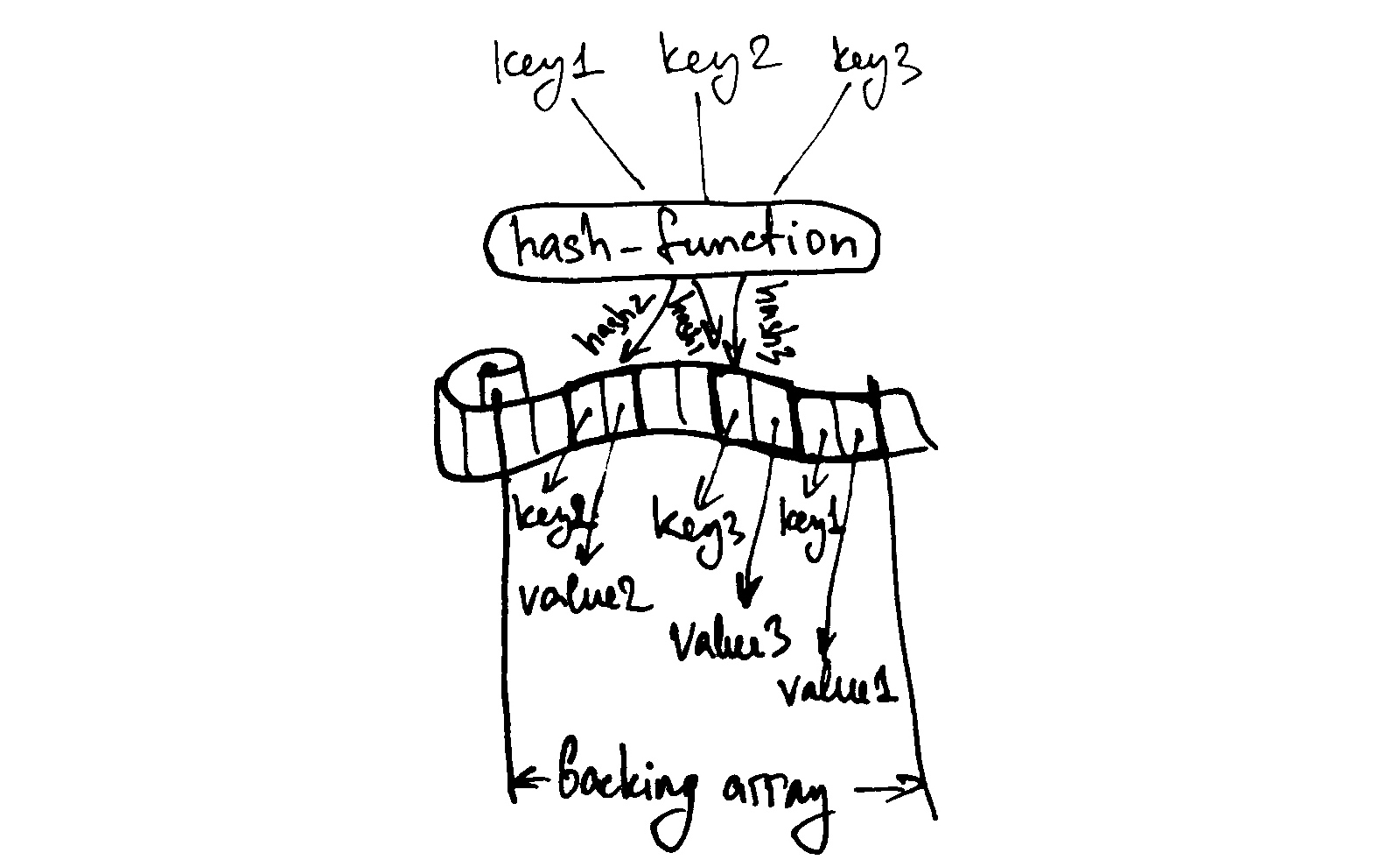 The more widely-used alternative to chaining is called “open addressing” or “closed hashing”. With it, the chains are, basically, stored in the same backing array. The algorithm is simple: when the calculated hash is pointing at an already occupied slot in the array, find the next vacant slot by cycling over the array. If the table isn’t full we’re guaranteed to find one. If it is full, we need to resize it, first. Now, when the element is retrieved by key, we need to perform the same procedure: calculate the hash, then compare the key of the item at the returned index. If the keys are the same, we’ve found the desired element, otherwise — we need to cycle over the array comparing keys until we encounter the item we need.