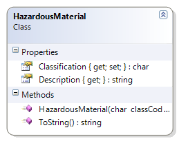 - HazardousMaterial – The HazardousMaterial class is a simple representation of the six main classes of hazardous materials (A through F). This class maps a classification code with a general description of the material’s classification: