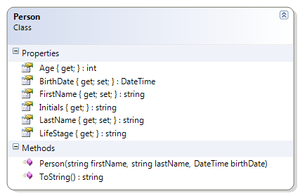 - Person - This adaptation of the person class checks the age of the person to see if the person’s life stage is infant, toddler, preschooler, school age, or adult.