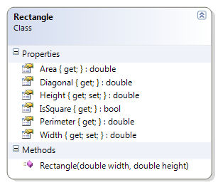 - Rectangle – “All squares are rectangles, but not all rectangles are squares.” This class represents a simple rectangle with a height and width. From this information, the area, perimeter and diagonal can be obtained; it can also be determined if the rectangle is or is not square.