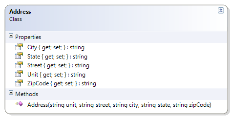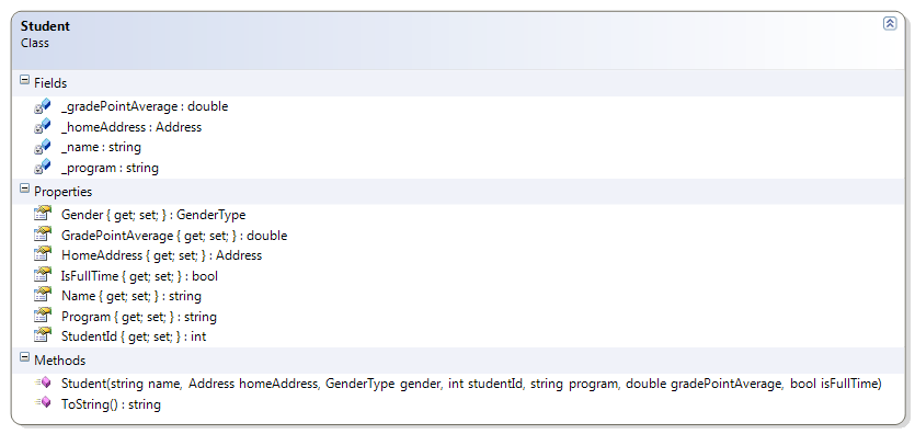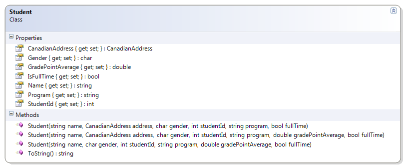 - Address + Student + GenderType – This revised version of the Student class now has an Address field. The address field is new; although similar to the CanadianAddress class, the Address class is simpler and more “generic” (having “State” instead of “Province” and “ZipCode” instead of “PostalCode”).