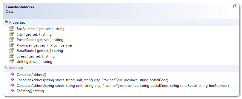 - CanadianAddress + Province – The CanadianAddress class is modified to now use a Province enumeration to properly capture the provinces and territories of Canada.