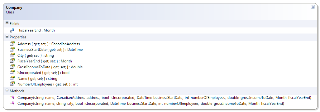 Modify the Company class to now make use of the CanadianAddress type for the address. Also, create an enumeration for the months of the year for representing the company’s fiscal year end.
