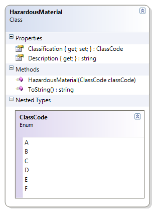 Rewrite the code for the HazardousMaterial class to make use of the ClassCode enumerated type. The solution must meet the following requirements (new requirements are in green, bold italic font):