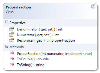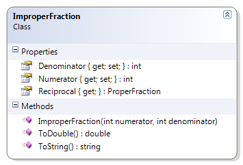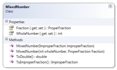 - ImproperFraction + MixedNumber + ProperFraction – In this sample, the idea of a Fraction class is made more specific by replacing it with three more specific types of numbers: MixedNumber, ProperFraction, and ImproperFraction. A MixedNumber is made up of a whole number and a ProperFraction. A MixedNumber can also be expressed as or derived from an ImproperFraction. The reciprocal of a ProperFraction is an ImproperFraction and the reciprocal of an ImproperFraction is a ProperFraction.