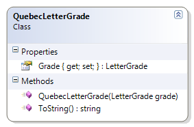 - LetterGrade + QuebecLetterGrade – The QuebecLetterGrade uses the simple LetterGrade enumeration and assigns specific ranges of percentage marks for the possible LetterGrade values.