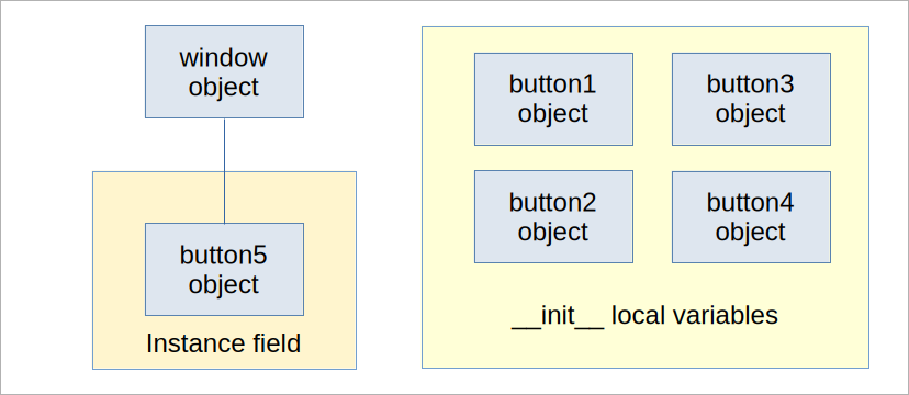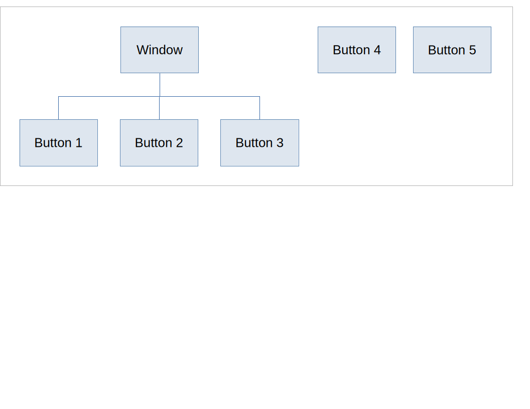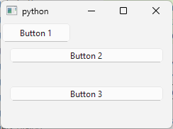 The first three buttons become the windows child widgets - directly or via the layout - and appear on the screen. The first button displays in the top-left corner since it is not in the layout. None of these three buttons are instance members of the Window Python object.