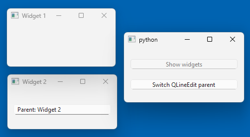 QLineEditobject to the layout ofwidget1.On clicking the ‘Switch parent’ button reparent the line edit. Remove it from the current widget’s layout, use