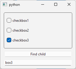 type: A PySide6 class such asQWidget,QLabel, orQCheckBox,name: The child’s object name, set viasetObjectName(). Defaults to an empty string so it must be set it explicitly for name-based searches (optional).pattern: AQRegularExpressioninstance for pattern matching.options: EitherQt.FindChildOptions.FindDirectChildrenOnlyorQt.FindChildOptions.FindDirectChildrenRecursively(optional).