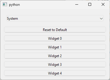In the main window code, add the theme selector widget the layout, providing it the available themes (‘Light’, ‘Dark’ and ‘System’), We also add a push button to reset the theme, and five push buttons to demonstrate the theme change effects. When the user selects a theme, themeChanged is emitted and the theme colors are applied using a stylesheet.