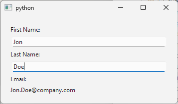 QWidgetto create a custom widget. The company domain (‘company.com’) is constant so we just assign the string literal to a field. First and last name need to be provided by the user so we provide two line edits for their entry. Declare two properties,firstnameandlastnamewith getters and setters.Declare a constant property. The