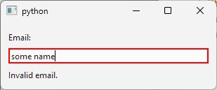 validate_email()slot check if the line edit contains empty text and if it is, remove theisValidproperty from the line edit object by setting it toNone. If the line edit contains text, validate it using Python’s regular expressions, and setisValidaccordingly. Finally, re-apply the style sheet by updating the line edit: