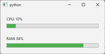 Now, when you start the application, it shows two bars that animate the machine CPU and memory values and are updated each second. Note that you don’t set the property value explicitly but with calling QPropertyAnimation.setEndValue().