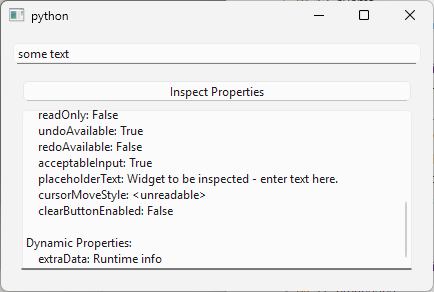 Now, when you start the application and click the Inspect Properties button, the text edit shows every static proeprty of the QlineEdit (objectName, text, placeholderText, etc.) followed by the dynamic property extraData that you added at runtime.