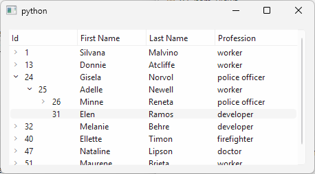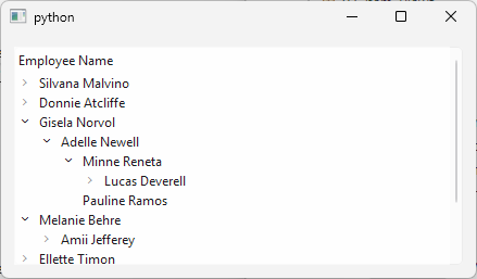 index()andparent(). The logic is the same as in the previous example, with two changes:index()usesTreeItem.child()to retrieve the child item instead of accessingchildrendirectly.parent()usesTreeItem.row()to determine the parent’s row instead of callingparent.children.index()directly.