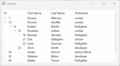 rowCount(),columnCount(),data()andheaderData(). We make several changes compared to the previous example:rowCount()usesTreeItem.child_count()instead oflen(children)directly. Note that it also returns zero for any column other than the first one - it is a Qt convention for tree models that only items in the first column have children.columnCount()usesTreeItem.column_count()data()usesTreeItem.data(), passing the index column to get the correct field.headerData()returns the appropriate label from theheaderlist.