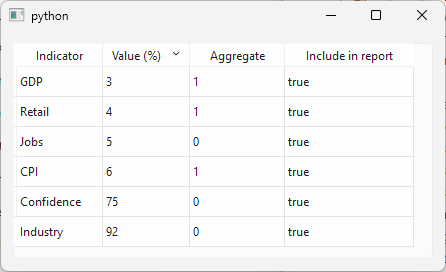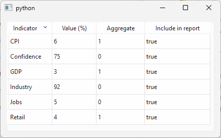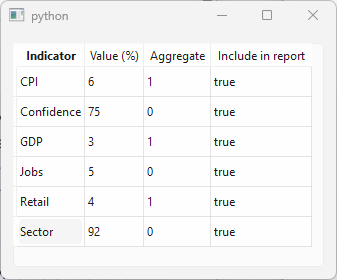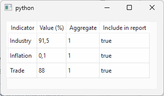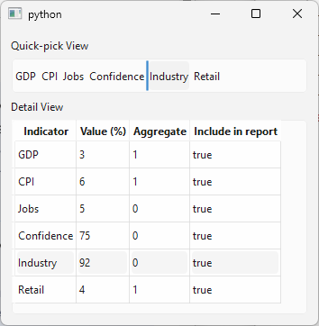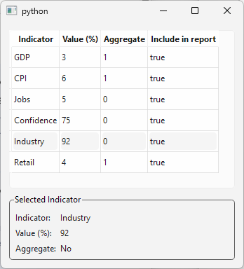 QGroupBoxwith aQFormLayoutcontaining threeQLabels, one each for indicator name, value, and aggregate flag, and add the group box to the main window.Connect the selection model’s