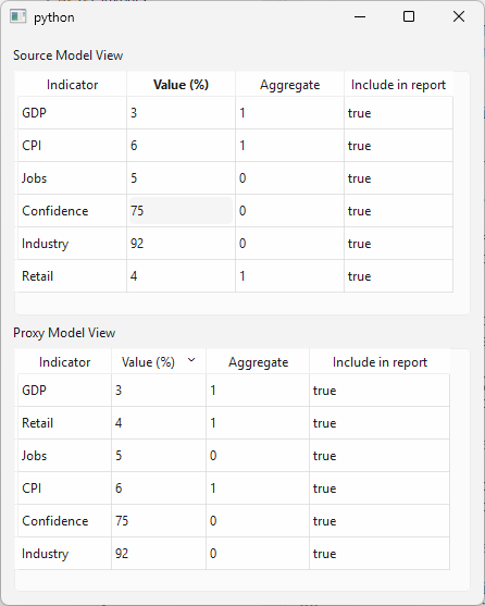 For comparison, this example places a source model view above the proxy model view. The source view has no sorting enabled. When you sort the proxy view, the source, the source view is not affected. Both views are editable and any change made through one is immediatelly reflected in the other.
