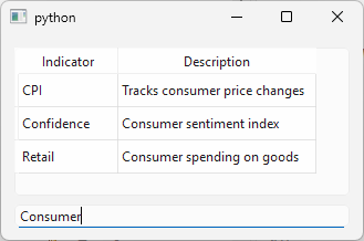 QTableViewand assign the proxy model to it withsetModel().Filter the source model based on the user input. Add a