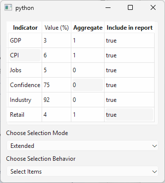You are building an economic indicators dashboard and need to understand how selection modes and behaviors affect user interaction. Configure a table view to switch between different selection modes and behaviors at runtime to explore their differences. |