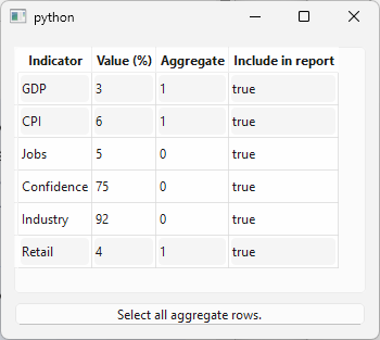 When you run the application, clicking on a non-aggregate row has no effect. Clicking aggregate rows selects them individually or in combination using Ctrl. Clicking the button selects all aggregate rows at once.