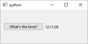 For interactivity, we’ve connected the button’s clicked signal to update the label with the current time using QTime.currentTime(). This shows an important point: Qt is more than a GUI toolkit and offers tools that overlap with Python’s - for instance the developer needs to decide whether to use time from the Python standard library or QTime from PySide6,QtCore.