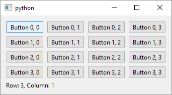 Here, we populate a 4x4 grid with 16 QPushButtons using two nested loops. Using sender() in the slot lets us identify the clicked button.