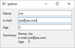 In this example, three QlineEdit fields handle user input. Their editingFinished is emitted on pressing Enter/Return or when focus leaves the changed field. A single slot updates a summary QLabel with the values. (No sender() needed here since we reference widgets directly.)