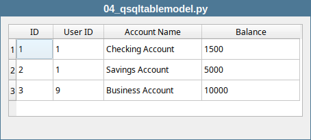 QSqlQueryModeland pass the query string tosetQuery()to execute the query. Checkmodel.query().lastError()to datect any errors, then set the horizontal header labels for each column.Create the view and assign the model to it. Instantiate a