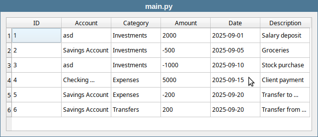 QStyledItemDelegatesubclass that provides aQDateEditeditor with a calendar popup for date columns. It overridescreateEditor()to return the configuredQDateEdit,setEditorData()to parse the stored date string into aQDate, andsetModelData()to write the selected date back to the model as a formatted string. SQLite has no native date type - it stores dates as plain strings. WithoutDateDelegate, the default editor for that column would be a plain line edit, leaving the user to type dates manually in the correct format.Build the transactions form.