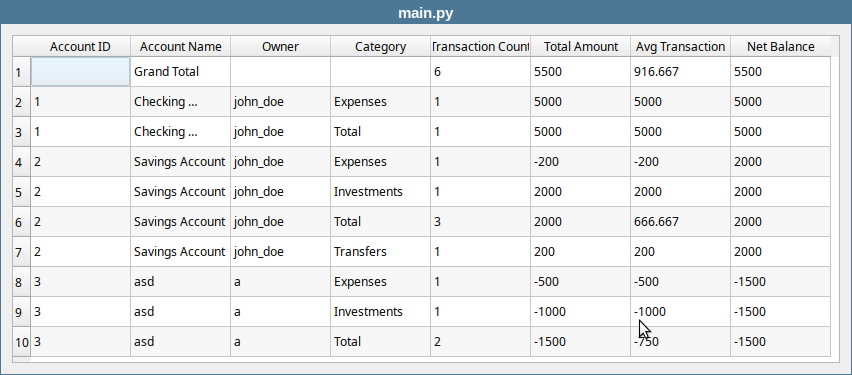 The above query is a bit involved and shows a September 2025 spending report that shows, for each account, a breakdown by category, followed by a subtotal for that account, with a grand total at the end.
