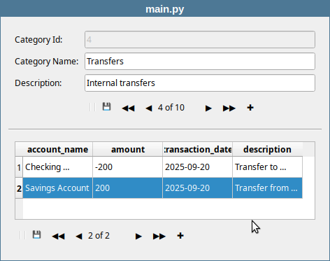In this example, selecting a category in the master form filters the transactions shown in the detail form. The example reuses CategoriesTableModel, NavBar and SingleRecordForm from the previous section and introduces two new classes: DateDelegate and TransactionForm.