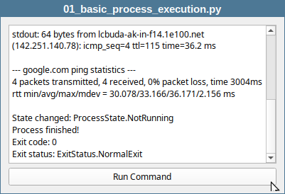log_stdout()reads all standard output data, decodes it and appends the output to the log widget.log_stderr()reads all standard error data, decodes it and appends it to the log.log_error()appends the error code and error string to the log.log_state_change()logs process state changes.log_finished()logs the process exit status and enables the ‘Run Command’ so the process can be run again.
