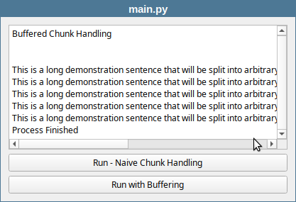 QProcessobject, connect the signals, and run the child process. When the user clicks the ‘Run with Buffering’ button:- Initialize an empty string buffer to accumulate incoming output chunks.