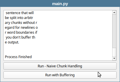 The full output is close to 800 characters spread across five repeated sentences. It deliberately splits its output into 20-byte chunks, calling sys.stdout.flush(), which forces readyReadStandardOutput() to be emitted on every chunk. When you read the output in the main application you need to buffer those chunks untill you encounter a newline character and only then display the complete line.