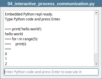QLineEditto the main window to let the user send commands to the Python shell, and aQTextBrowserto display the shell output. ConnectQLineEdit.returnPressed()tosend_input(). ConnectreadyReadStandardOutput()andreadyReadStandardError()signals to the slots. Start the Python executable with the following flags:-uto force the stdout and stderr streams to be unbuffered.-ito enter interactive mode, keeping the shell alive and waiting for input.qto suppress the copyright and version banner on startup. Once thestartedsignal is emitted, the Python interactive shell is ready to accept commands. Enable theQLineEditand give it focus.