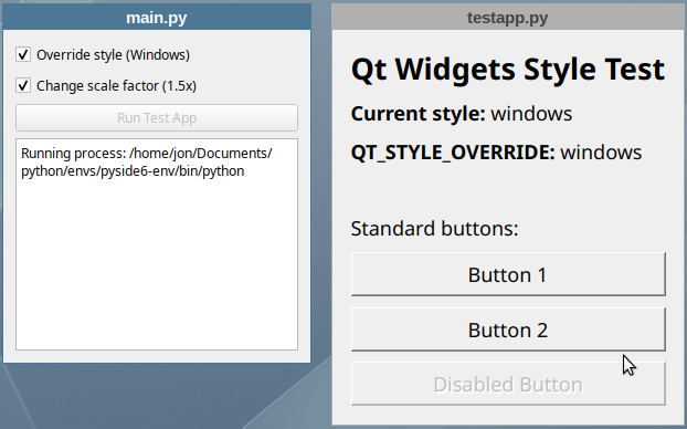 When you change the environment variables from the main application and run it, the test app should reflect the changes - appearing with the Windows style when the style checkbox is checked, rendered at 1.5x size when the scale checkbox is checked, or both at once if both are checked.