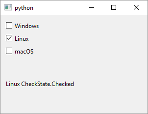 QCheckBoxobject and set its display text. We create three checkboxes and add them to the window’s layout. We also set each checkboxobjectNameproperty. SettingobjectNamecan be useful in debugging or when you need to find a widget usingQObject.findChild().-