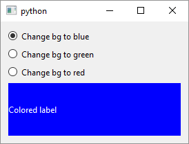 toggled()signal. In this case the slot has an argument thattoggleddoes not provide namedcolor.colorholds a string containing a color name and each radio button provides an appropriate color to the slot using a lambda. Qt offers its own version of CSS (cascading style sheets), called QSS2 which you can apply to widgets usingQWidget.setStyleSheet(). This is how we change the label’s background and foreground colors when a raio button is toggled.Connect the signals and the slot. In this case lambdas are needed to pass the extra argument to the slot.
