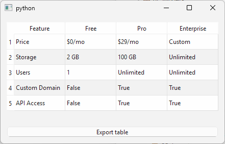 QTableWidgetinstance and set the table dimensions. The table in the example has five rows and four columns. We also add a label to the window and a push button for exporting the comparison matrix.Fill the table cells with data. Each table cell is represented with a
