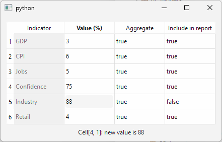 A key distinction between QTableWidget and QTableView is in their handling of data. QTableWidget is well-suited for semi-structured or heterogeneous data, where individual cells can vary in type or format without column consistency - for instance, allowing a user to enter ‘Maybe’ in a boolean-like field instead of strictly True or False. In contrast, QTableView, paired with a model, is suitable for use with structured data, as model typically enforce uniform data types and validation rules per column. This flexibility makes QTableWidget ideal for quick prototypes and ad-hoc tables, while QTableView supports more scalable, data-driven applications.