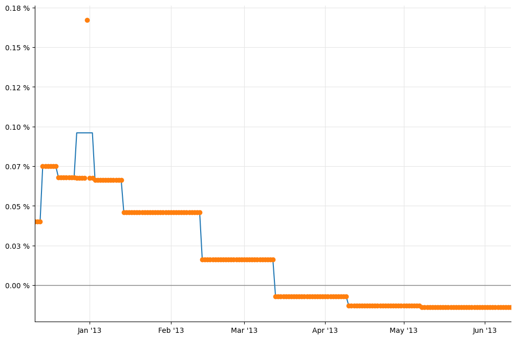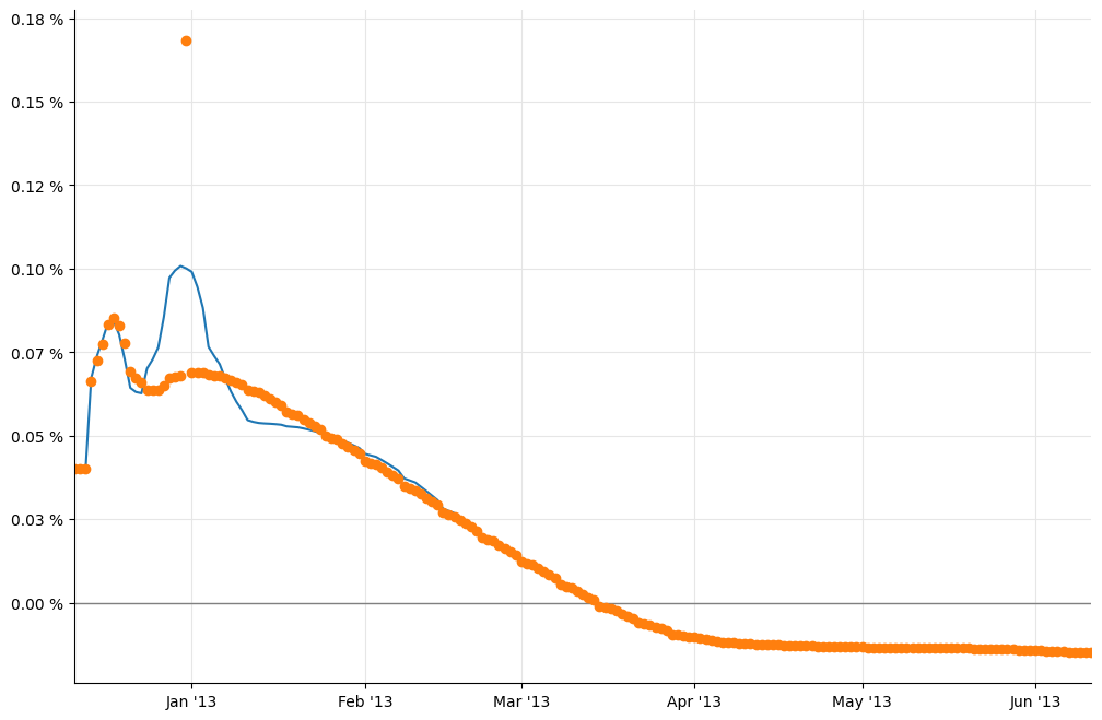 utils.plot_curve(ax, dates, [(rates_ff,'-'), (rates_j,'o')],