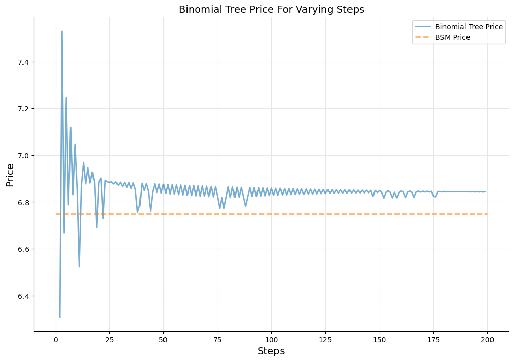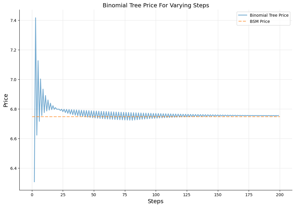 In the plot below, we show the convergence of binomial-tree approach by comparing its price with the BSM price.