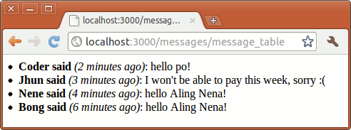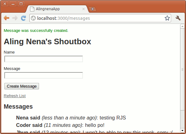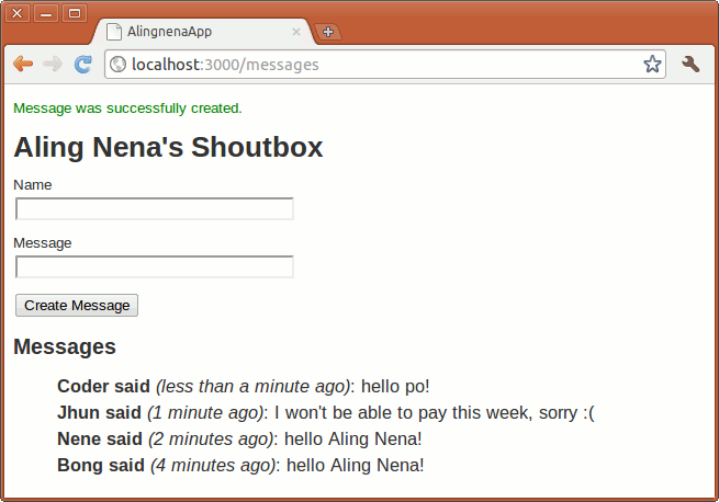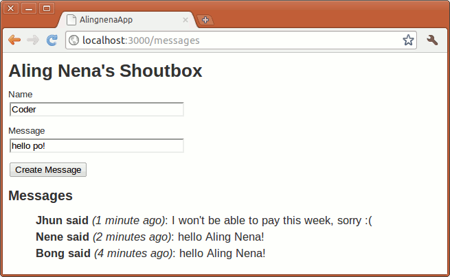 To demonstrate the basic uses Rails built-in jQuery functions, we’ll use a simple shoutbox program that allows visitors of Aling Nena’s website to leave a message for all to see: