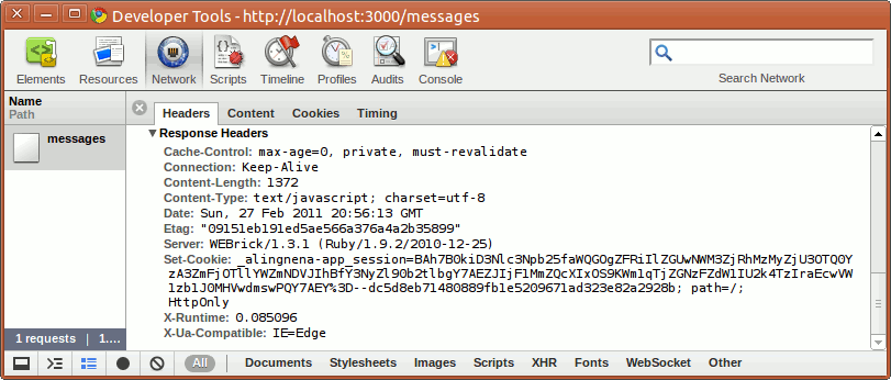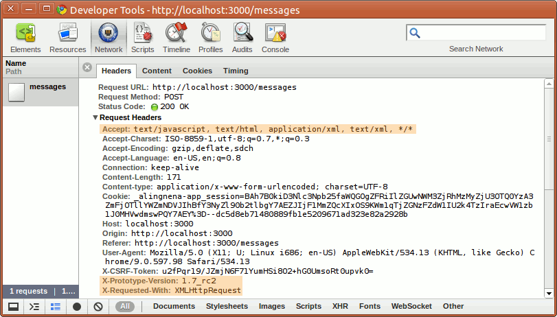From the request headers, we could see that it’s using XHR and Prototype. However, the important thing here to note is the text/javascript in the Accept header which tells Rails the format the request requires.