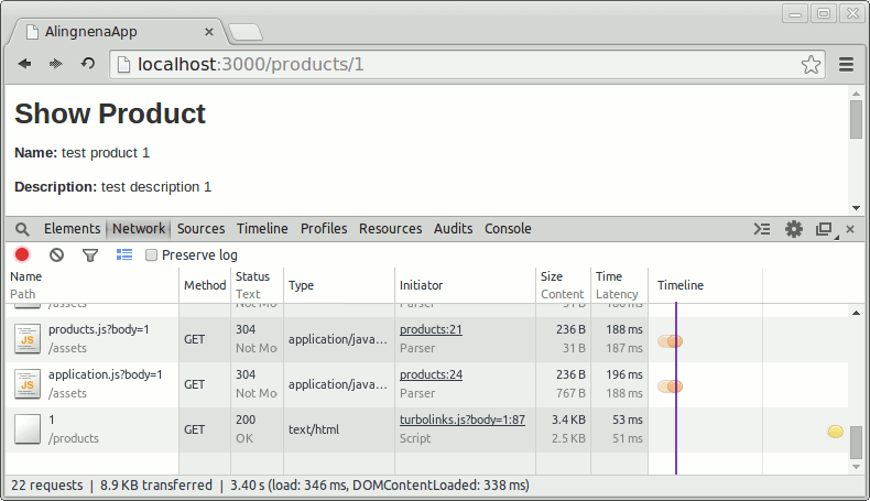 Turbolinks converts all GET links into Ajax calls like the one we did for the “refresh list”. However, instead of replacing just a fragment of the page, Turbolinks replaces the entire page via the Ajax call and modifies the browser state/URL with the target page. If the browser does not support PushState for manipulating browser history and state, Turbolinks will fall back to normal link GET behavior. You can verify this by opening your browser’s developer tools and clicking on any “Show” link, for example the “Show Product” link:
